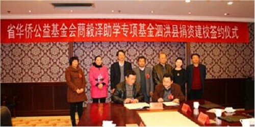 2014年1月27日,在馬年新春佳節(jié)即將到來(lái)之際,江蘇省華僑公益基金會(huì)蔄毅澤助學(xué)專項(xiàng)基金捐建泗洪縣曹廟鄉(xiāng)唐楊小學(xué)簽約儀式在泗洪縣北辰國(guó)際會(huì)展中心隆重舉行。省委省級(jí)機(jī)關(guān)工委副書記楊慶國(guó),省僑聯(lián)副主席鎮(zhèn)翔,省僑聯(lián)副主席、省級(jí)機(jī)關(guān)僑聯(lián)主席、省國(guó)資委副主任李琨,泗洪縣委常委、組織部長(zhǎng)范德珩,省僑聯(lián)副巡視員、文化聯(lián)絡(luò)部部長(zhǎng)藍(lán)曉霜,基金捐助者、澳籍華人蔄毅澤等出席了簽約儀式。