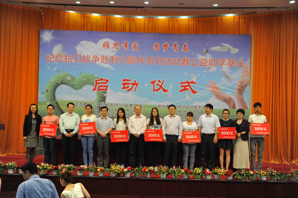 啟動儀式上,與會領(lǐng)導向環(huán)球雅思助學金受助學生代表發(fā)放助學金并合影留念。市僑界藝術(shù)團的演員們現(xiàn)場演唱紀念抗日戰(zhàn)爭勝利70周年的歌曲,活動在慷慨激昂的歌聲中圓滿結(jié)束。