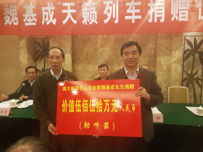 “魏基成天籟列車”是由澳大利亞紙業(yè)大王、澳大利亞ABC紙巾公司總裁、江蘇省華僑公益基金會榮譽會長魏基成先生于2009年創(chuàng)辦的慈善項目,旨在向貧困聽障者和聾啞兒童提供免費的助聽器,幫助他們走出無聲世界,解決其學習、就業(yè)和生活中的實際困難。此次“魏基成天籟列車”駛入江蘇,通過省華僑公益基金會向我省聽障青少年、兒童和有關學校捐贈2500臺助聽器和500臺語音教學機(價值約550萬元),向我省蘇北5市貧困老人捐贈5000件冬衣(價值約250萬元),合計捐贈物品價值達800萬元。加上今年10月17日“全國扶貧日”捐贈我省泗陽縣價值500多萬元的冬衣和助聽器,“魏基成天籟列車”今年已累計向我省捐贈價值1300多萬元的物品。該捐贈項目也是省華僑公益基金會自成立以來接受捐贈數額最大的一個公益項目