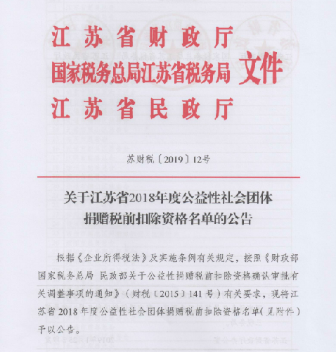 2019年1月,江蘇省財政廳、省稅務局和省民政廳關于“公益性社會團體捐贈稅前扣除資格”聯(lián)合發(fā)文,公布資格名單,江蘇省華僑公益基金會被列入名單中: