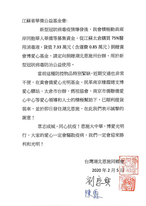 疫不容緩,防疫如救火。恩施地處湖北邊陲,新型冠狀病毒疫情爆發(fā)后,防控物資特別緊缺。在恩施臺(tái)灣同鄉(xiāng)會(huì)發(fā)出緊急求援后,南京市僑聯(lián)立即響應(yīng),積極倡議海內(nèi)外華人華僑捐款捐物。市僑聯(lián)副主席林柏協(xié)調(diào)江蘇華僑之家博愛心驛站、市僑聯(lián)僑愛心光明基金,從江蘇太倉(cāng)緊急購(gòu)買220桶75%醫(yī)用消毒液,通過江蘇省華僑公益基金會(huì)博愛心基金,定向捐贈(zèng)湖北恩施土家族苗族自治州。
