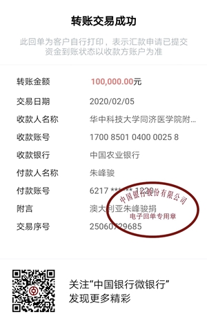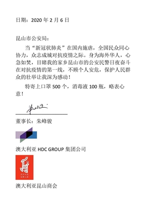 澳籍華人、澳大利亞昆山商會(huì)會(huì)長朱峰駿先生個(gè)人捐款10萬元,并購得12000只專業(yè)口罩、進(jìn)口防護(hù)服及消毒液用于捐贈(zèng)武漢協(xié)和醫(yī)院,并向昆山市公安局定向捐贈(zèng)民用口罩及消毒液。