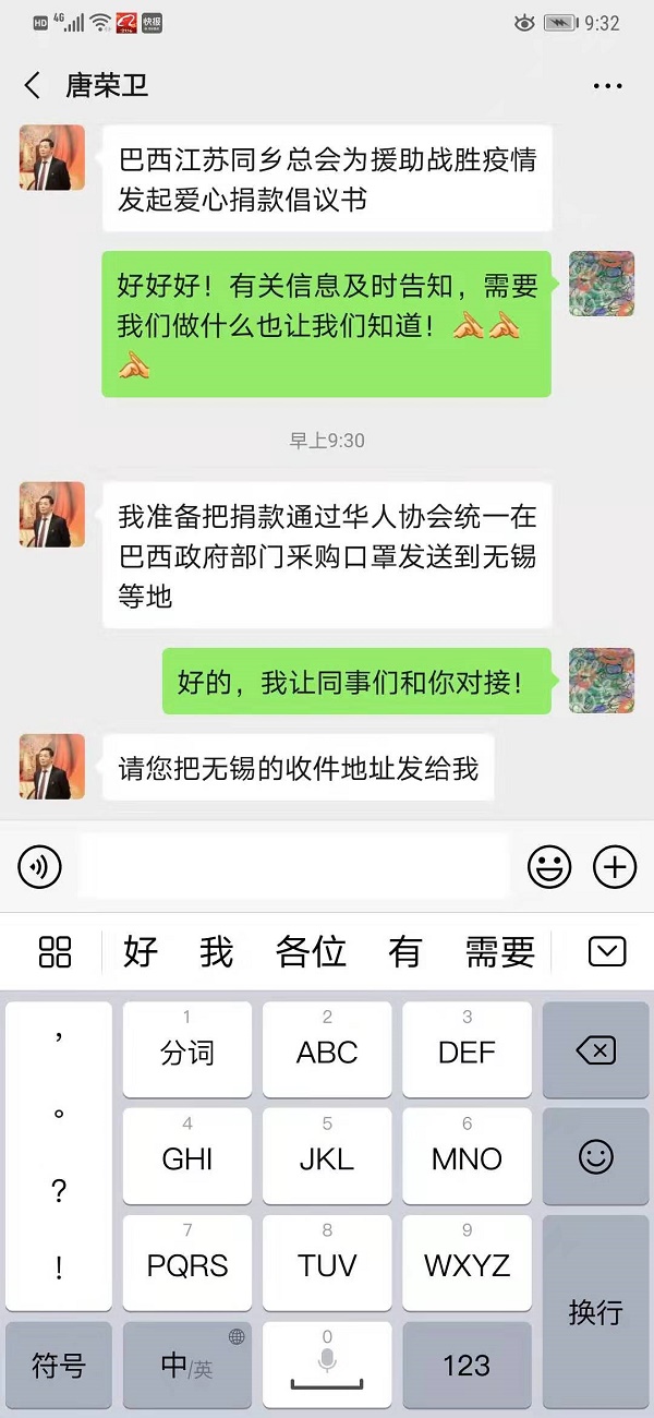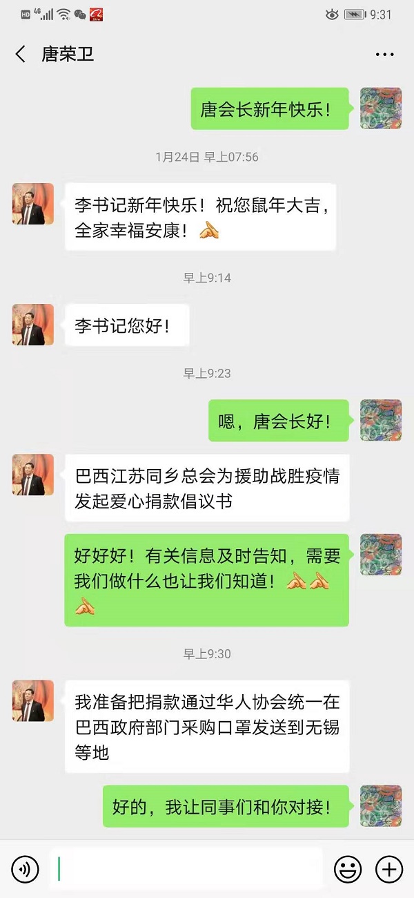 春節(jié)前夕,新冠肺炎疫情的爆發(fā)牽動(dòng)著海內(nèi)外僑胞的心。無錫市僑聯(lián)發(fā)出倡議,海外僑胞紛紛以多種方式展開聯(lián)動(dòng),捐贈(zèng)善款、籌集物資,愛心支援抗擊疫情。遠(yuǎn)在巴西的江蘇同鄉(xiāng)會(huì)會(huì)長唐榮衛(wèi)先生得知國內(nèi)的疫情,積極與市僑聯(lián)李鎮(zhèn)國書記聯(lián)系,立即表示要為援助戰(zhàn)勝疫情發(fā)起愛心捐款倡議,用捐來的善款購買口罩發(fā)往無錫。