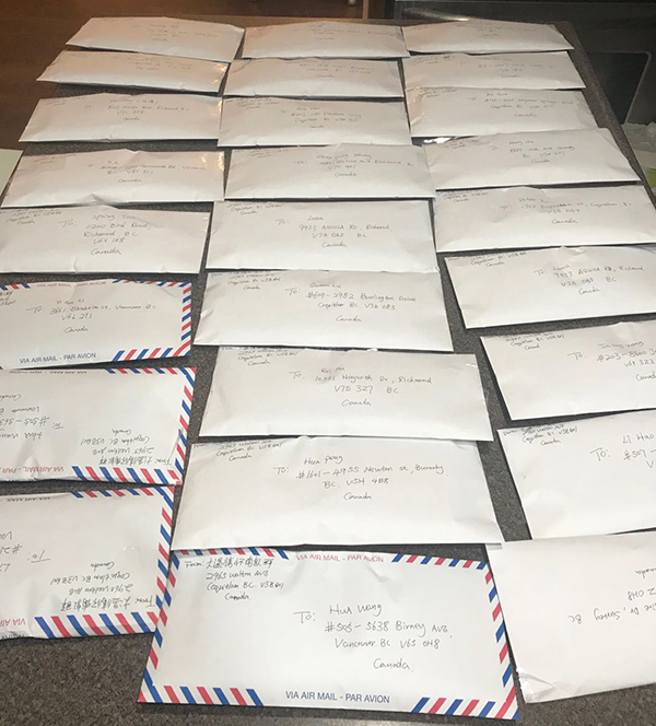 “大溫情懷應急小組”通過郵寄方式為溫哥華南京籍僑胞家庭免費提供口罩
