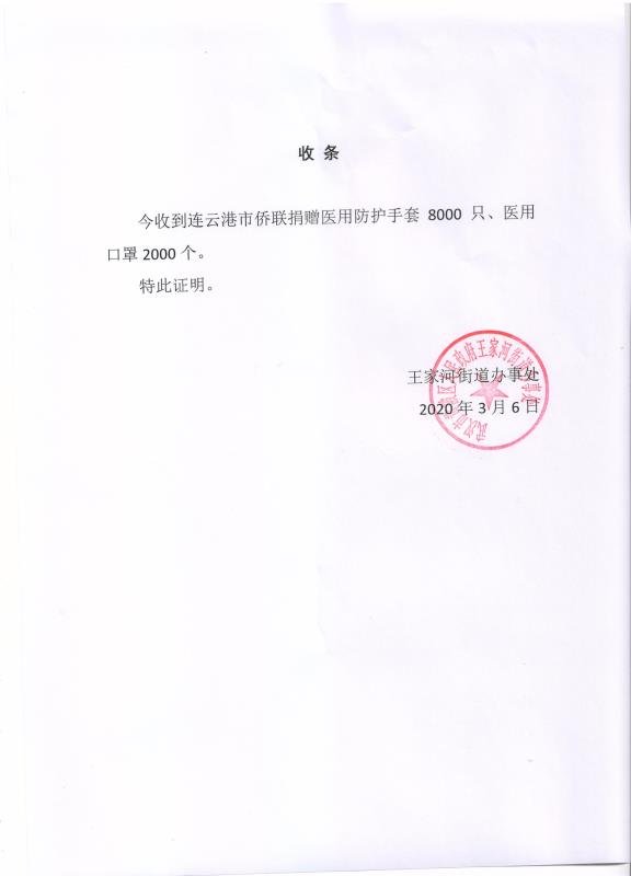 近日,武漢市黃陂區(qū)王家河街道辦事處向連云港市僑聯(lián)發(fā)來捐贈收據(jù)并向僑界群眾表示感謝。2月18日,連云港市僑界群眾向武漢疫區(qū)基層一線定向捐贈的8000只醫(yī)用防護(hù)手套、2000只醫(yī)用口罩順利運(yùn)抵武漢,并在第一時間交付給街道負(fù)責(zé)人,助力武漢人民早日戰(zhàn)勝疫情。