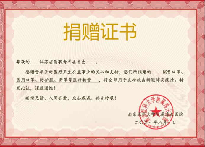 南京醫(yī)科大學(xué)附屬逸夫醫(yī)院向省僑聯(lián)青年委員會(huì)發(fā)來捐贈(zèng)證書,衷心感謝僑界的關(guān)心支持。醫(yī)院有關(guān)負(fù)責(zé)人表示,要將黨委政府的高度重視和社會(huì)各界的關(guān)心,轉(zhuǎn)化為抗擊疫情的強(qiáng)大動(dòng)力,全力完成黨和人民賦予的重任,在保障群眾生命安全、守護(hù)人民健康幸福中,踐行初心使命。