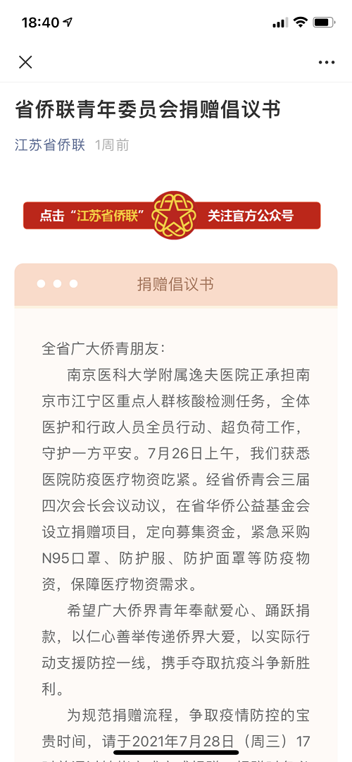 南京祿口機(jī)場(chǎng)突發(fā)新冠肺炎疫情,牽動(dòng)著海內(nèi)外僑胞、僑青的心。在省僑聯(lián)的支持和指導(dǎo)下,省僑青會(huì)、省華僑公益基金會(huì)倡議,以不同方式表示慰問、奉獻(xiàn)愛心,僅用48小時(shí)就募集30余萬元善款,緊急采購N95口罩、醫(yī)用外科口罩、醫(yī)用防護(hù)衣和防護(hù)面罩等醫(yī)療防疫物資,馳援位于疫情重點(diǎn)區(qū)域、承擔(dān)重點(diǎn)人群核酸采集和收治任務(wù)的南京醫(yī)科大學(xué)附屬逸夫醫(yī)院。首批捐贈(zèng)物資已經(jīng)于7月28日晚間運(yùn)抵醫(yī)院。中國(guó)僑聯(lián)兼職副主席、省僑聯(lián)黨組書記、主席周建農(nóng)對(duì)僑胞僑青的大愛善舉表示衷心感謝,希望大家堅(jiān)定信心、眾志成城,攜手筑就抵御疫情的鋼鐵長(zhǎng)城。