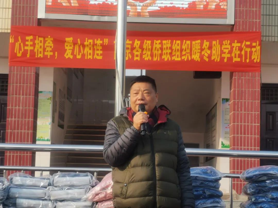 捐贈儀式上,南京市僑聯(lián)一級調(diào)研員、僑商會常務(wù)副會長王金剛致辭,他說,很高興來到這里為孩子們送上溫暖和祝福。扶貧濟(jì)困,捐資助學(xué)是中華民族的傳統(tǒng)美德。僑商素有愛國愛鄉(xiāng)情懷,在自然災(zāi)害、教育、扶貧等方面慷慨解囊。今天南京僑商聯(lián)合會是第二次來到浦口區(qū)舉辦愛心捐贈活動,展現(xiàn)了僑商血濃于水的同胞深情。今天的活動非常有意義,希望“衣+衣=愛”暖冬公益行動持續(xù)舉辦下去,激勵更多的愛心人士奉獻(xiàn)愛心。他給孩子們提出三點(diǎn)希望:一是要感恩生活在中國共產(chǎn)黨領(lǐng)導(dǎo)下的這個偉大時代,認(rèn)識到只有中國共產(chǎn)黨才給我們帶來了幸福生活;二是要感恩生活在南京這個城市,這個有著深厚文化底蘊(yùn)和博愛的歷史文化名城,一定會激勵同學(xué)們努力學(xué)習(xí),掌握本領(lǐng);三是要感恩生活在這個學(xué)校,目前學(xué)校條件雖然不是太好,但是這里的老師、政府都非常關(guān)心你們,希望這次“暖冬行動”為同學(xué)們帶去寒冬里暖暖的愛,希望同學(xué)們不辜負(fù)期望,好好學(xué)習(xí),長大后回饋社會,報(bào)效祖國!