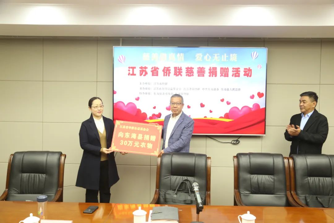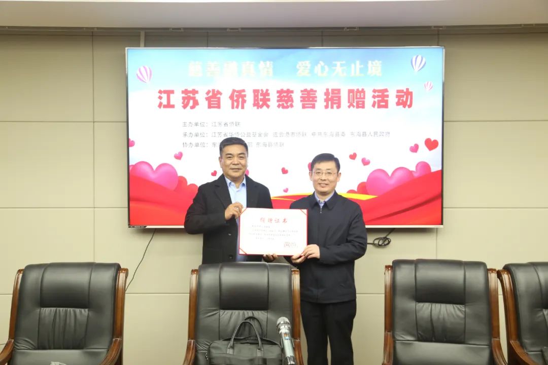 捐贈儀式上,周政代表江蘇省華僑公益基金會向東??h捐贈價值30萬元的慈善物資。尹相倫向捐贈單位代表頒發(fā)證書。
