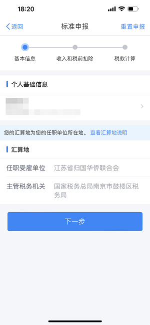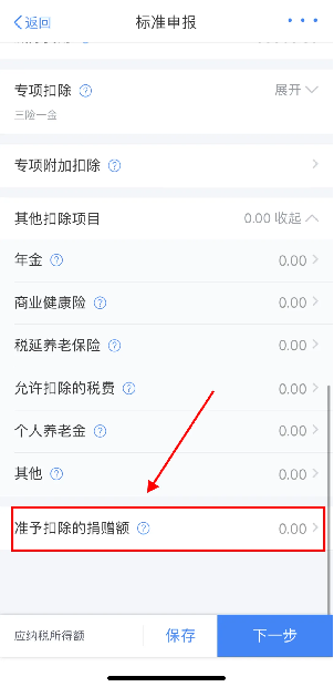 確認(rèn)基本信息后點(diǎn)擊“下一步”→進(jìn)入【標(biāo)準(zhǔn)申報(bào)】頁面滑動(dòng)至頁面底部→點(diǎn)擊“準(zhǔn)予扣除的捐贈(zèng)額”