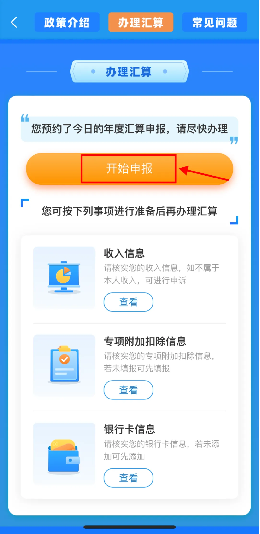 選擇預(yù)約日期→顯示預(yù)約成功后,按預(yù)約時(shí)間登錄個(gè)人所得稅APP→選擇綜合所得年度匯算,點(diǎn)擊“開始申報(bào)”