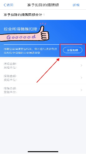 如果有多張捐贈(zèng)票據(jù),全部票據(jù)登記完成后,點(diǎn)擊“分配扣除”,填寫“綜合所得捐贈(zèng)扣除金額”,保存并繼續(xù)完成年度匯算清繳。