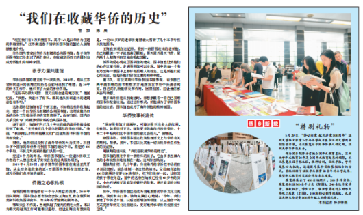6月3日,《人民日?qǐng)?bào)》以“我們?cè)谑詹厝A僑的歷史”為題,報(bào)道了南通赤子情華僑圖書館的創(chuàng)辦過程和開辦后所發(fā)揮的作用。 南通赤子情華僑圖書館是由近50個(gè)國(guó)家的數(shù)千位華僑華人捐資、捐...
