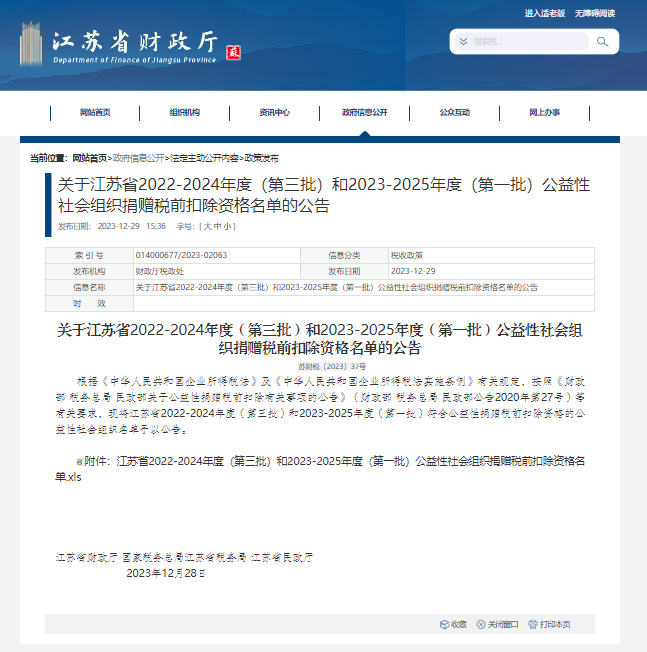 2023年12月29日,江蘇省財政廳、國家稅務(wù)總局江蘇省稅務(wù)局和江蘇省民政廳聯(lián)合發(fā)布《關(guān)于江蘇2022-2024年度(第三批)和2023-2025年度(第一批)公益性社會組織捐贈稅前扣除資格...
