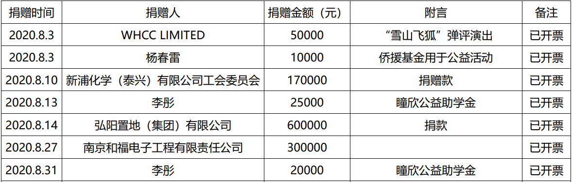 江蘇省華僑公益基金會2020年八月捐款明細(xì)