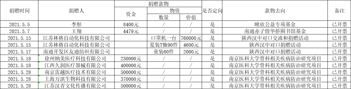 江蘇省華僑公益基金會2021年五月捐款明細(xì)