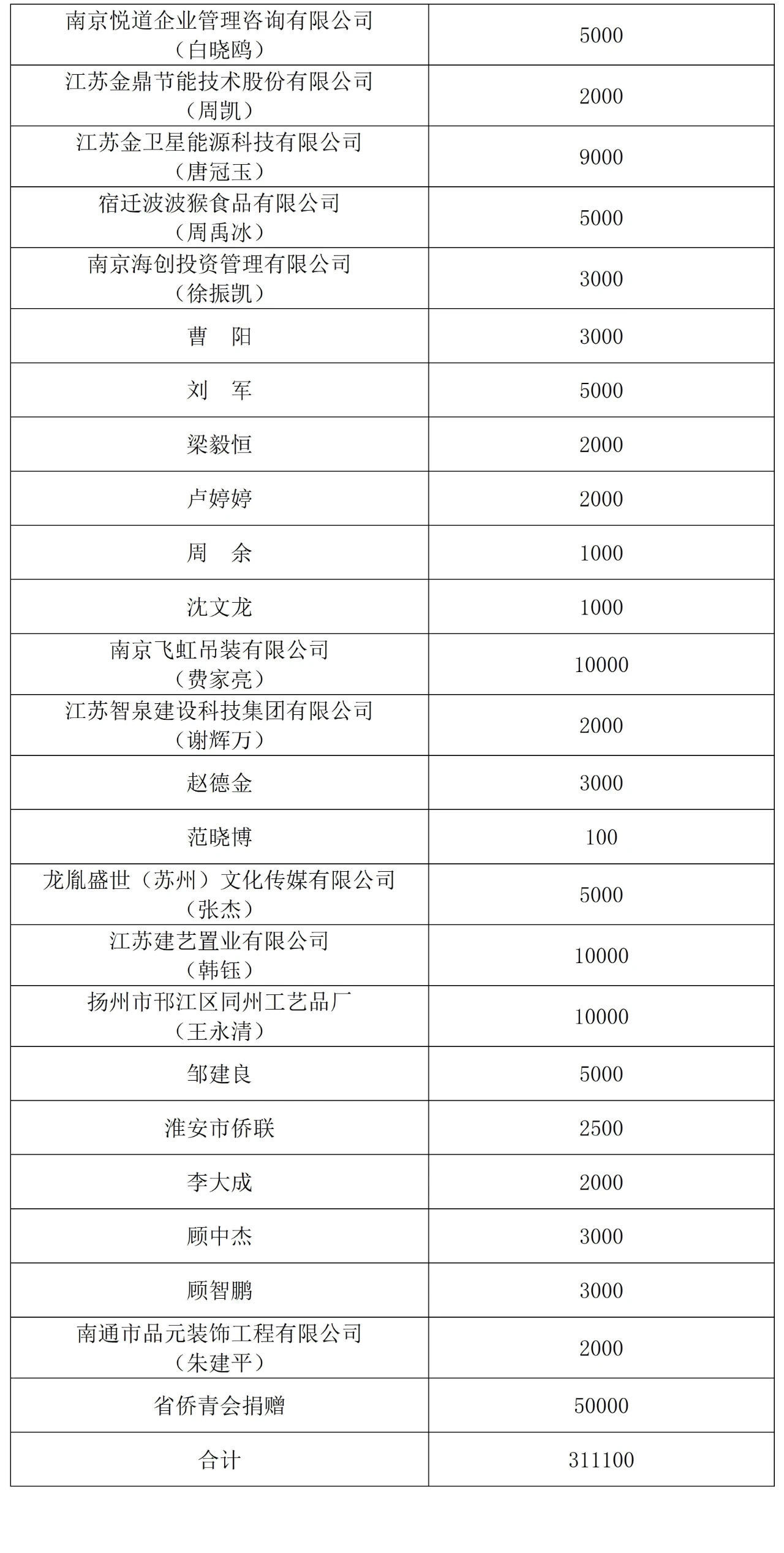 南京祿口機(jī)場發(fā)生的疫情,牽動著海內(nèi)外僑界青年的心,紛紛通過各種方式表達(dá)關(guān)切、提供支持。7月26日,江蘇省僑聯(lián)青年委員會召開三屆四次會長會議,決定在江蘇省華僑公益基金會設(shè)立“僑青助力抗疫”捐贈項(xiàng)目,倡議廣大僑界青年奉獻(xiàn)愛心、支援一線抗疫。截止7月29日下午17時,累計(jì)收到捐款31.11萬元,其中省僑青會經(jīng)費(fèi)捐贈5萬元,接受僑青、僑胞和省僑聯(lián)聯(lián)誼聯(lián)絡(luò)部黨支部捐款26.11萬元。現(xiàn)予公示。