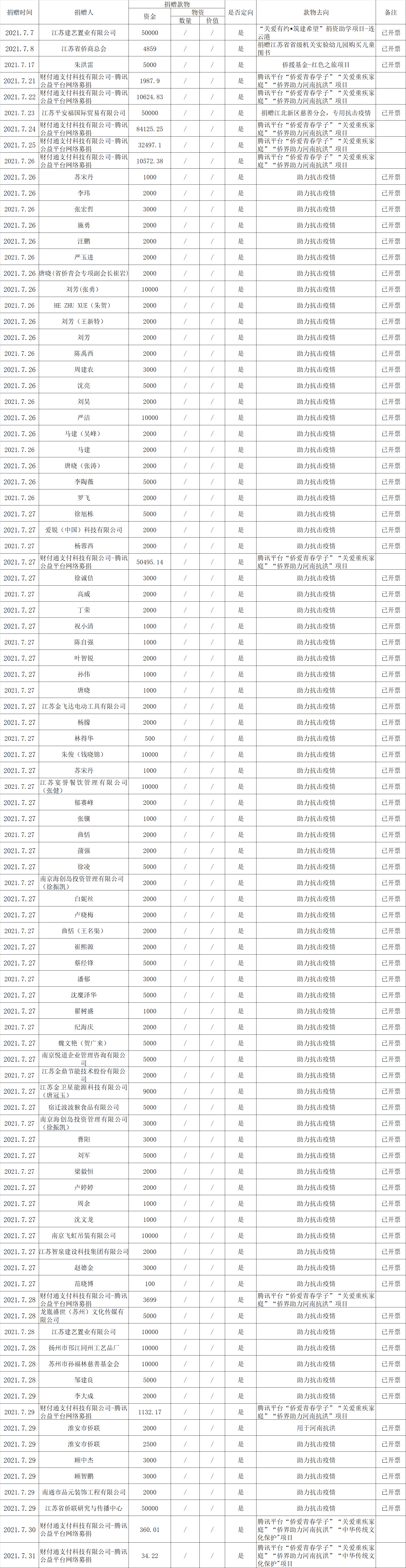 江蘇省華僑公益基金會(huì)2021年七月捐款明細(xì)