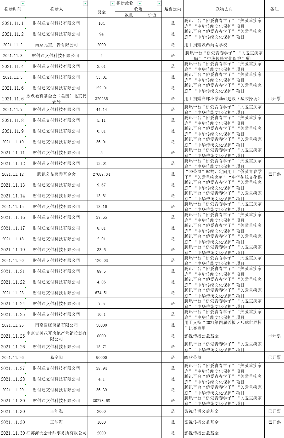 江蘇省華僑公益基金會(huì)2021年十一月捐款明細(xì)