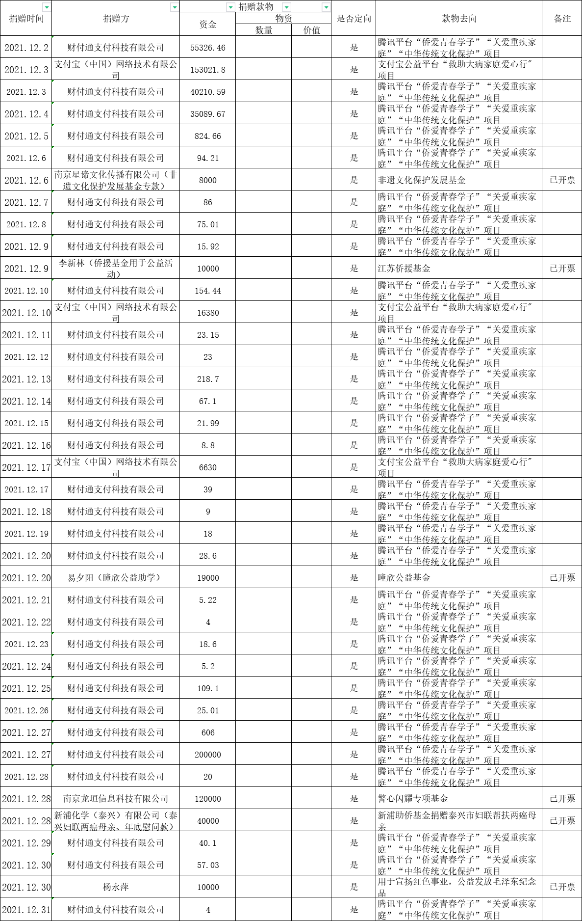 江蘇省華僑公益基金會(huì)2021年十二月捐款明細(xì)