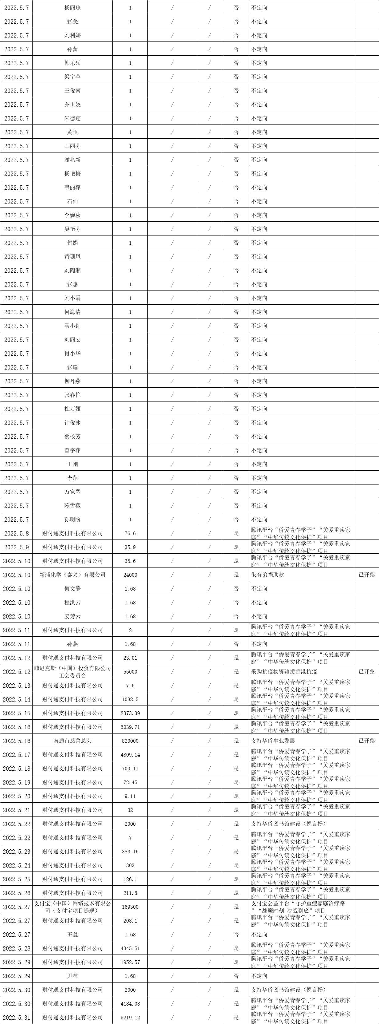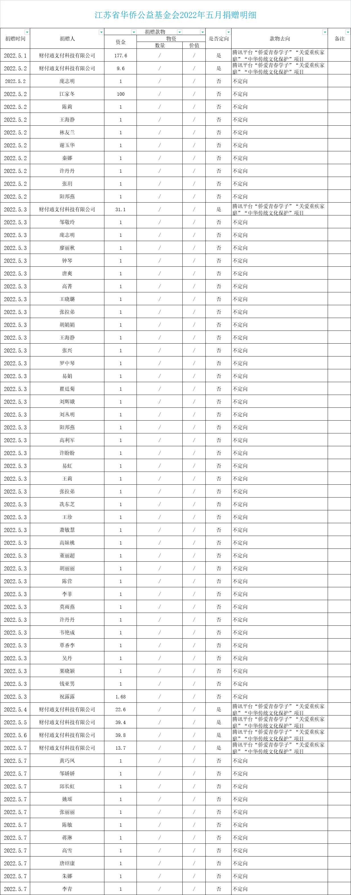 江蘇省華僑公益基金會(huì)2022年五月捐贈(zèng)明細(xì)