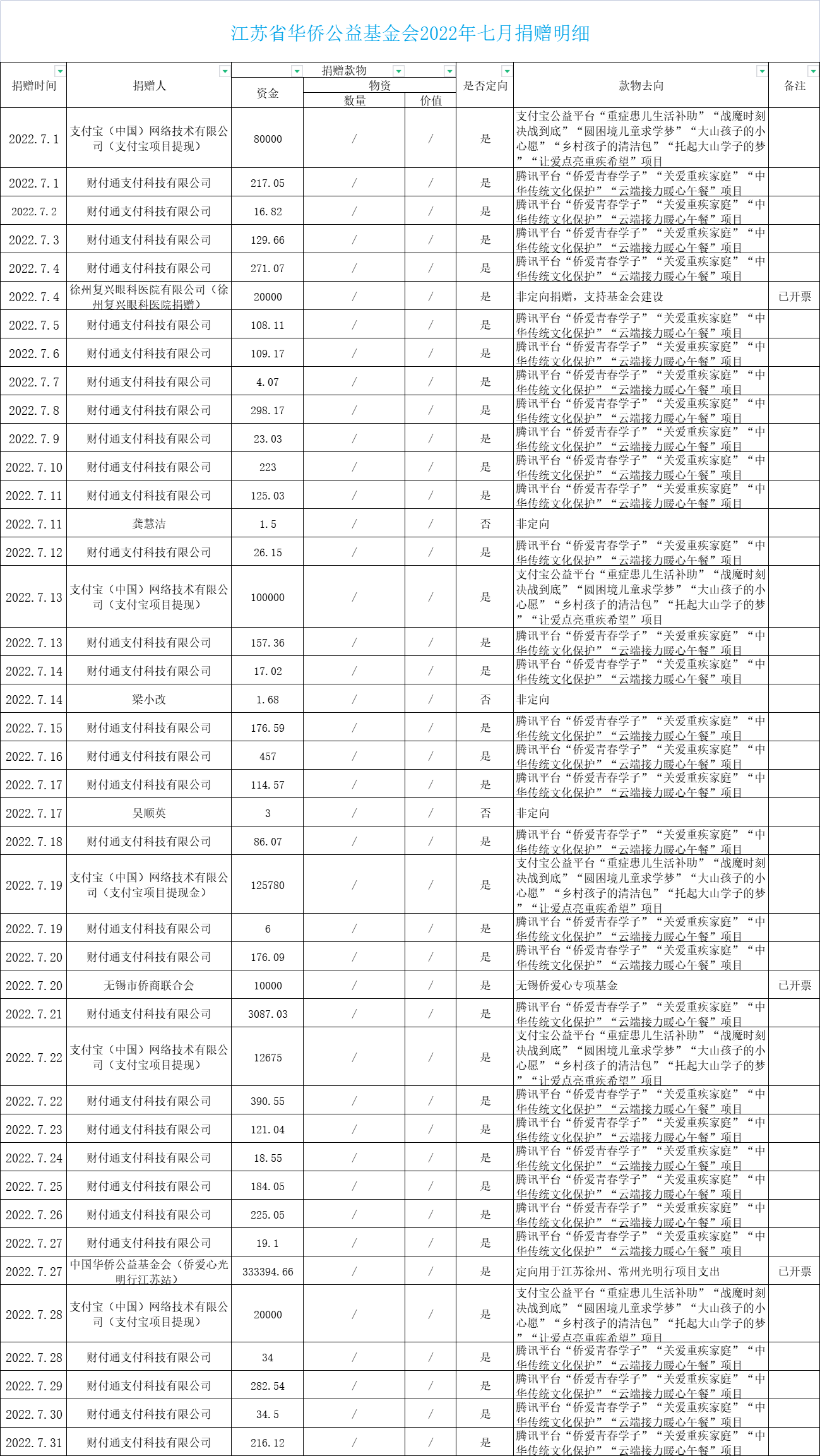 江蘇省華僑公益基金會2022年七月捐贈明細(xì)