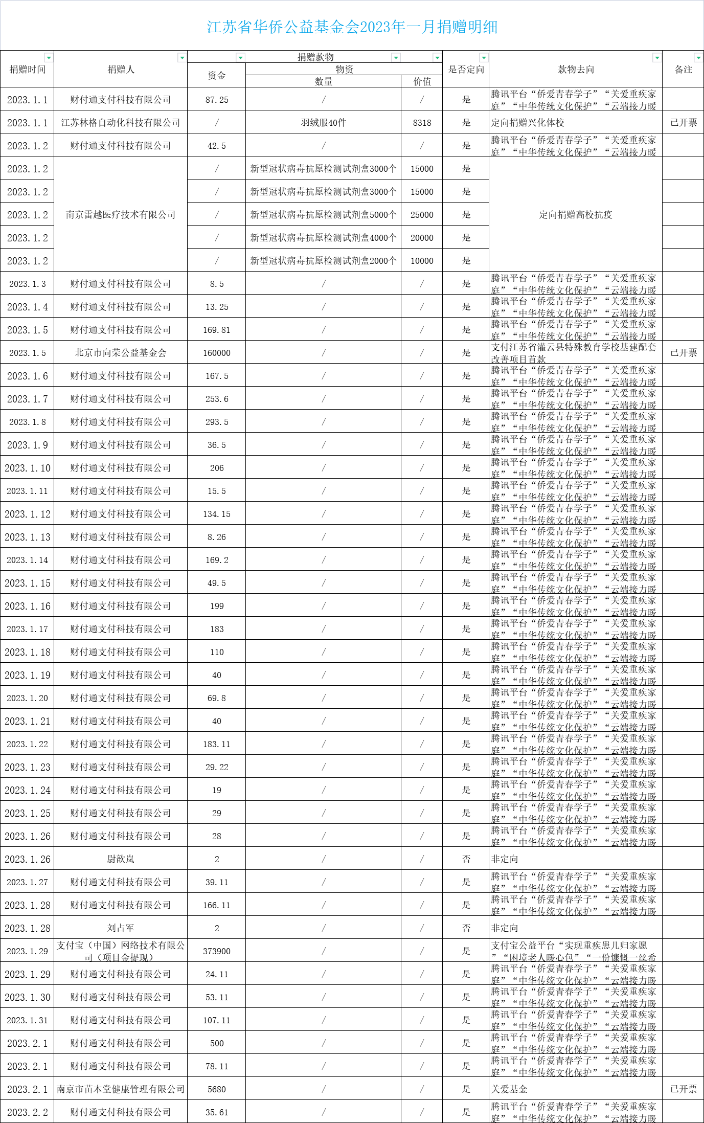 江蘇省華僑公益基金會(huì)2023年一月捐贈(zèng)明細(xì)