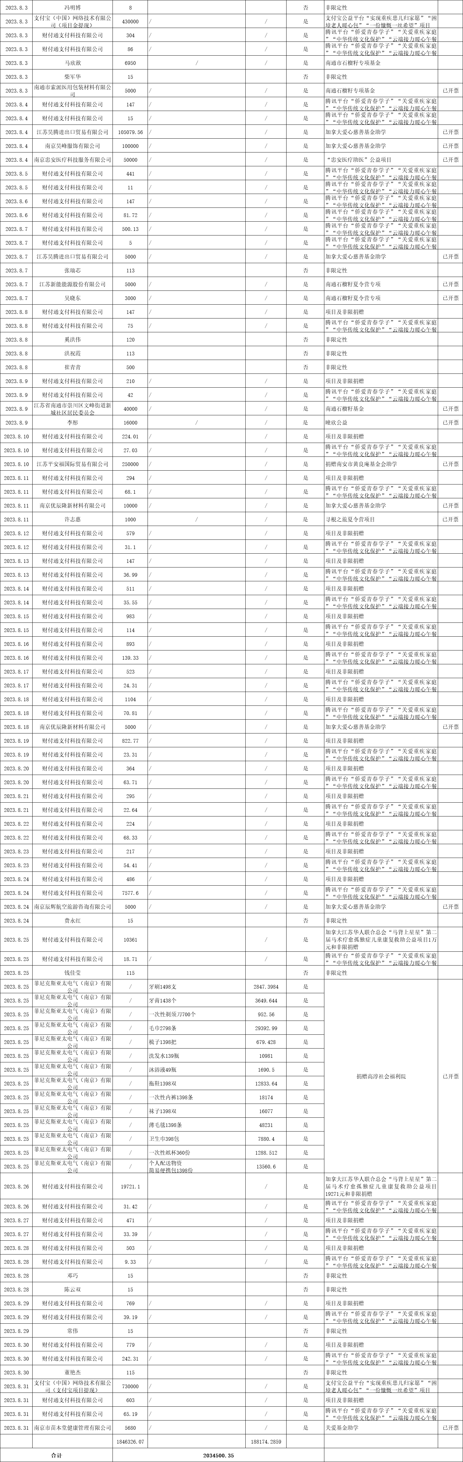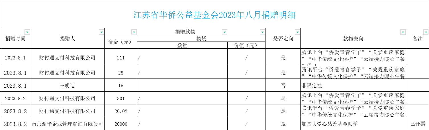 江蘇省華僑公益基金會2023年八月捐贈明細(xì)