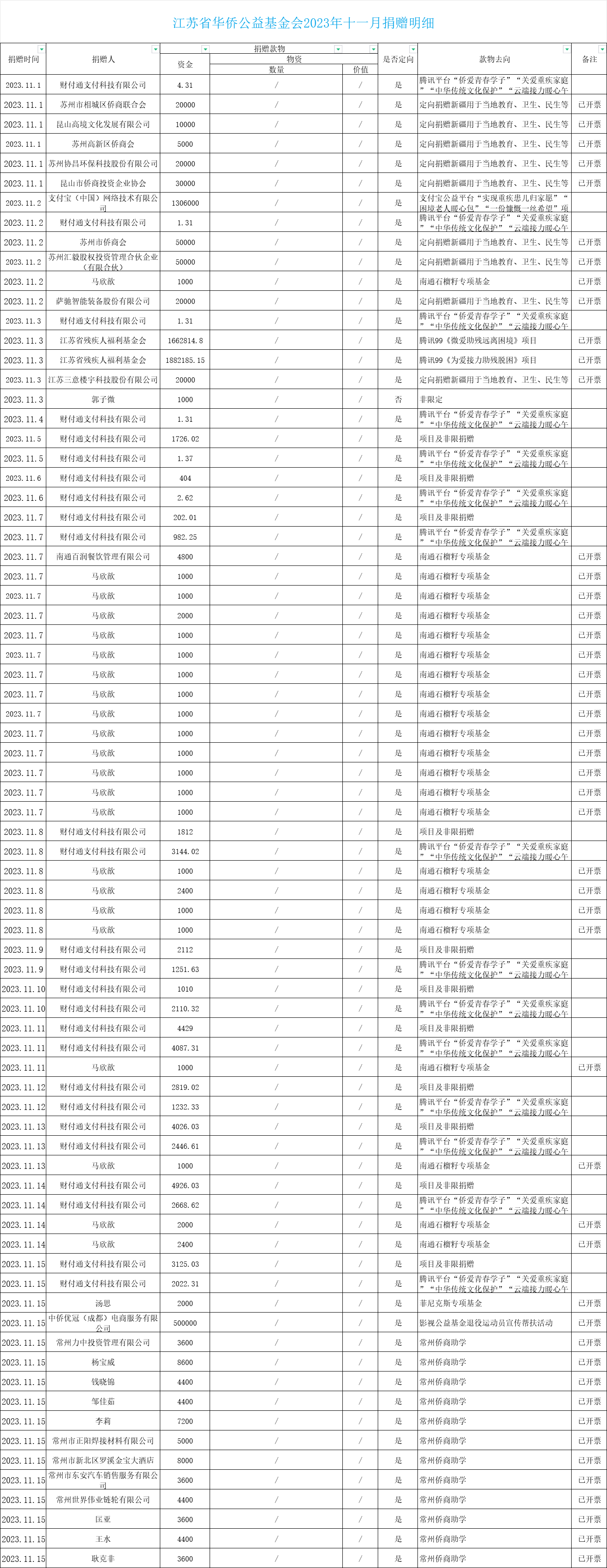 江蘇省華僑公益基金會(huì)2023年十一月捐贈(zèng)明細(xì)