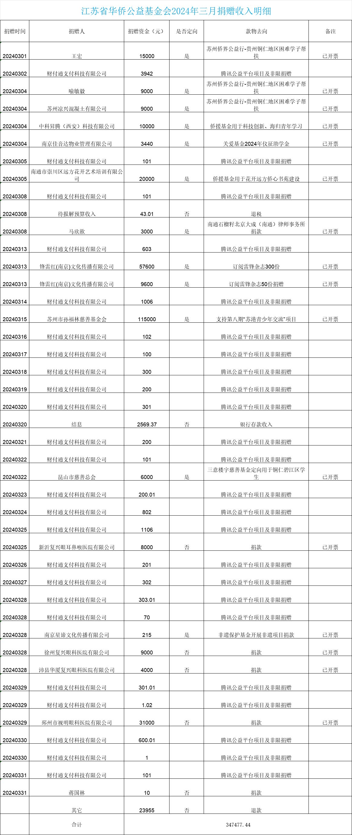 江蘇省華僑公益基金會2024年三月捐贈收入明細(xì)