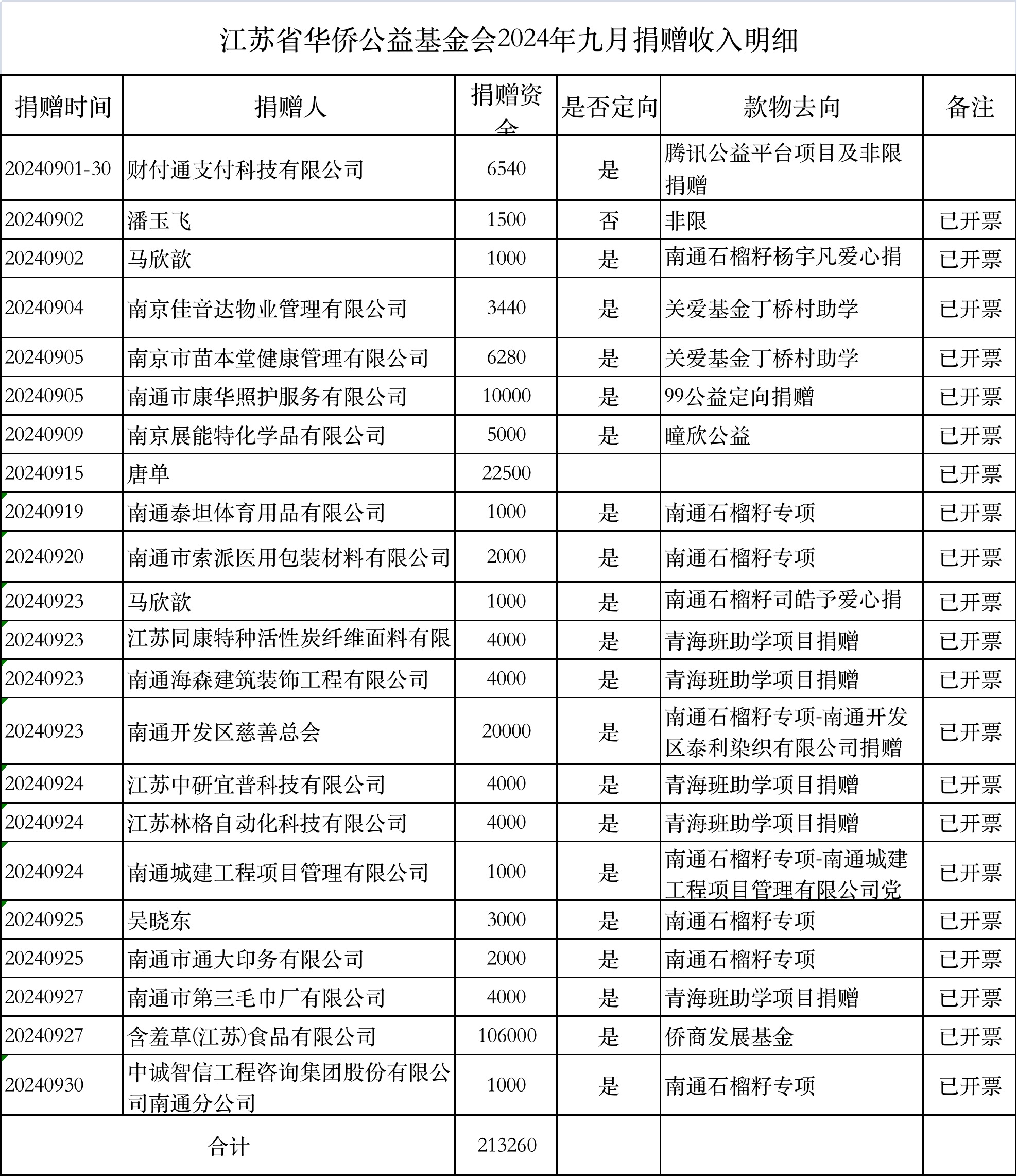 江蘇省華僑公益基金會(huì)2024年九月捐贈(zèng)收入明細(xì)