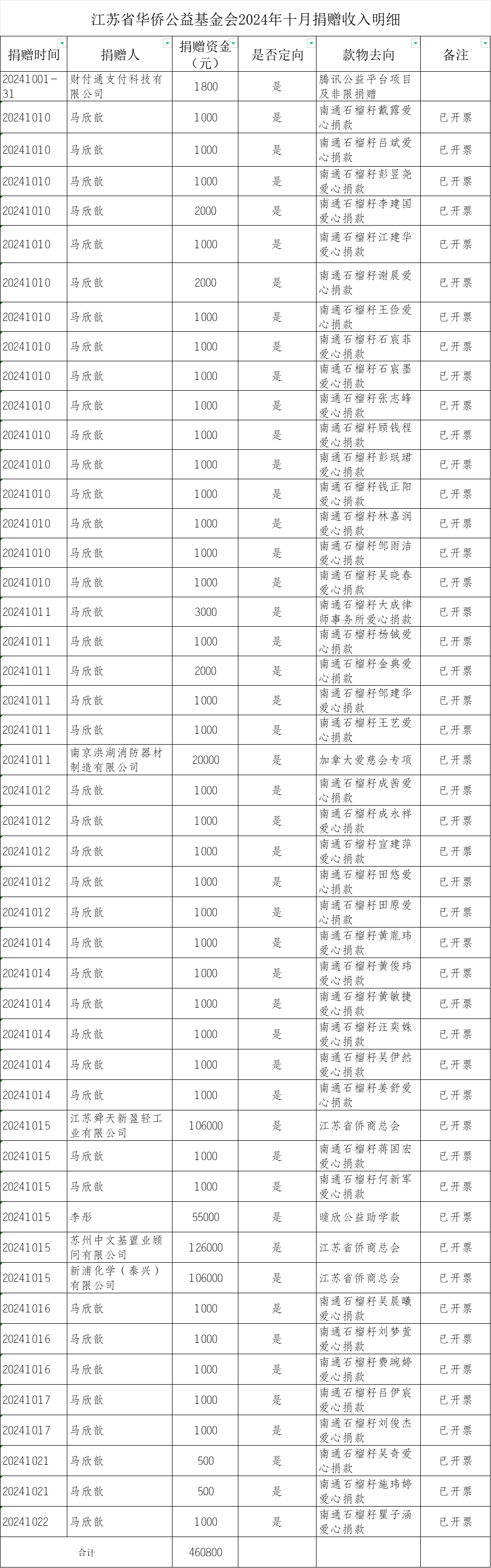 江蘇省華僑公益基金會(huì)2024年十月捐贈(zèng)收入明細(xì)